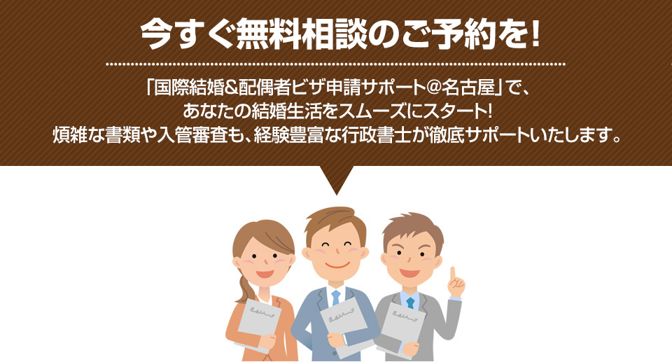 ![[中部エリア]プロの行政書士がスムーズ&確実にサポートします!名古屋で国際結婚・配偶者ビザの手続きをサポート!まずはお気軽にご相談下さい!無料相談受付中。対面・オンライン相談対応。専門の行政書士(国家資格者)が対応いたします。](https://samurai-nagoya.com/marriage/wp-content/themes/nagoya_marriage/images/top_main.jpg)